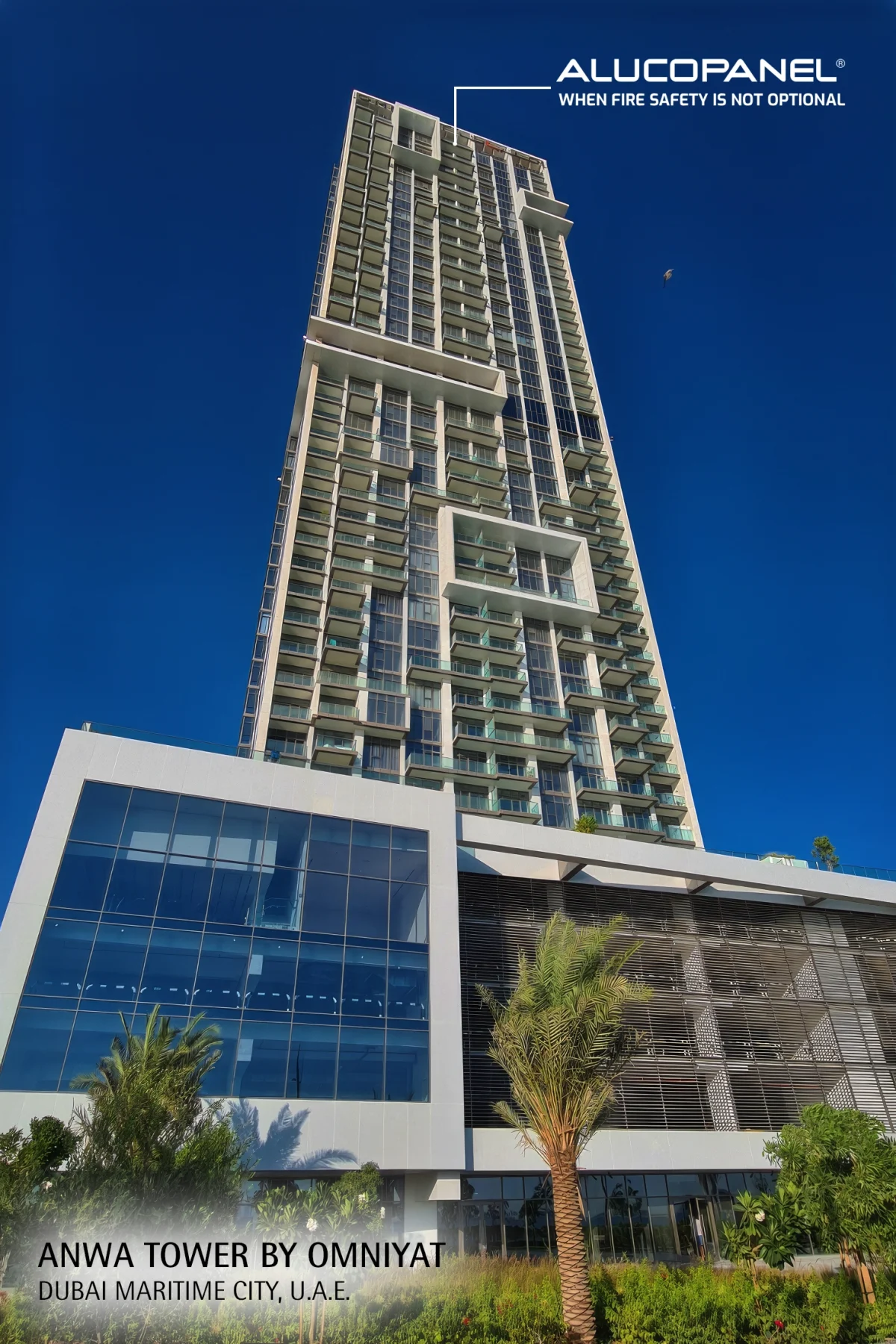 The first and tallest tower in Dubai Maritime City. Proudly clad with Alucopanel® A2 Aluminium Composite Panels. A custom Lexus White shade was developed in a 3-coat system, designed specifically to achieve the required depth, durability, and finish quality. From the tower, residents have unobstructed views of the world’s tallest Burj Khalifa and the full stretch of the Dubai skyline. The façade meets A2 fire-safety standards, in line with Dubai’s regulations, combining aesthetics with compliance