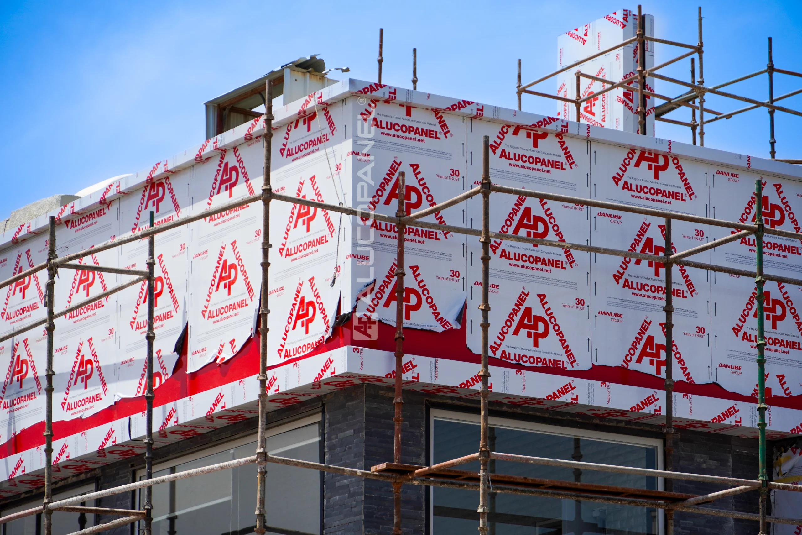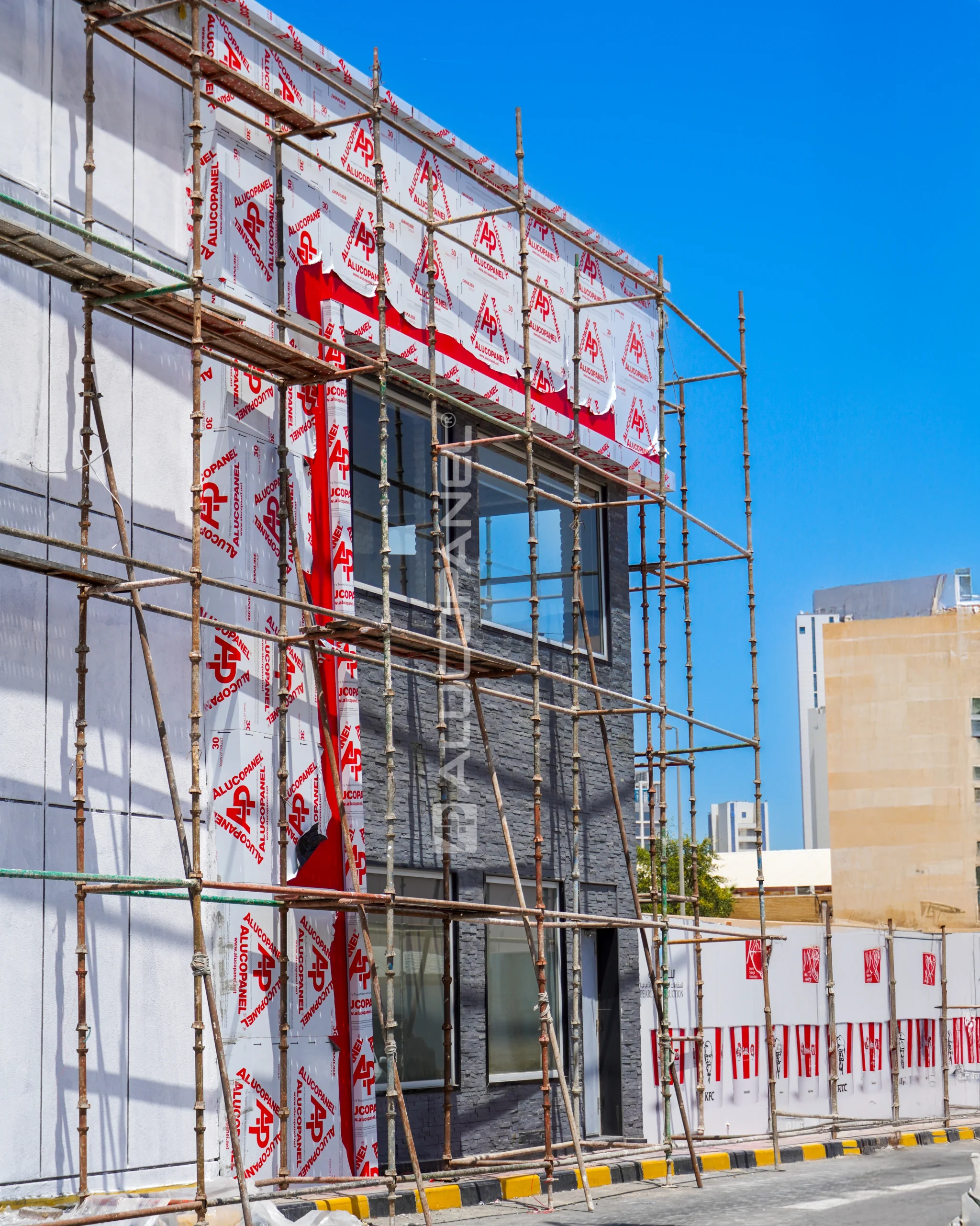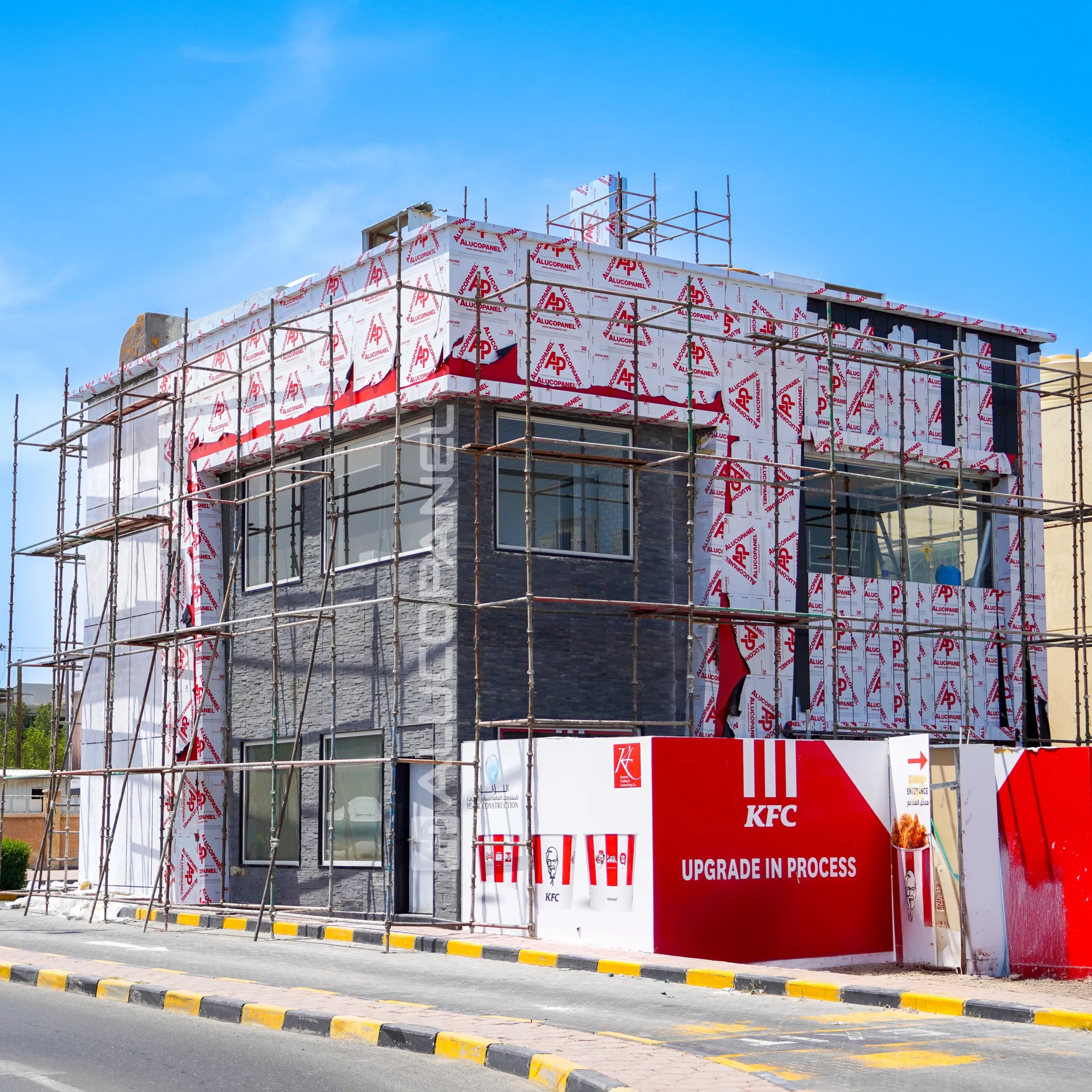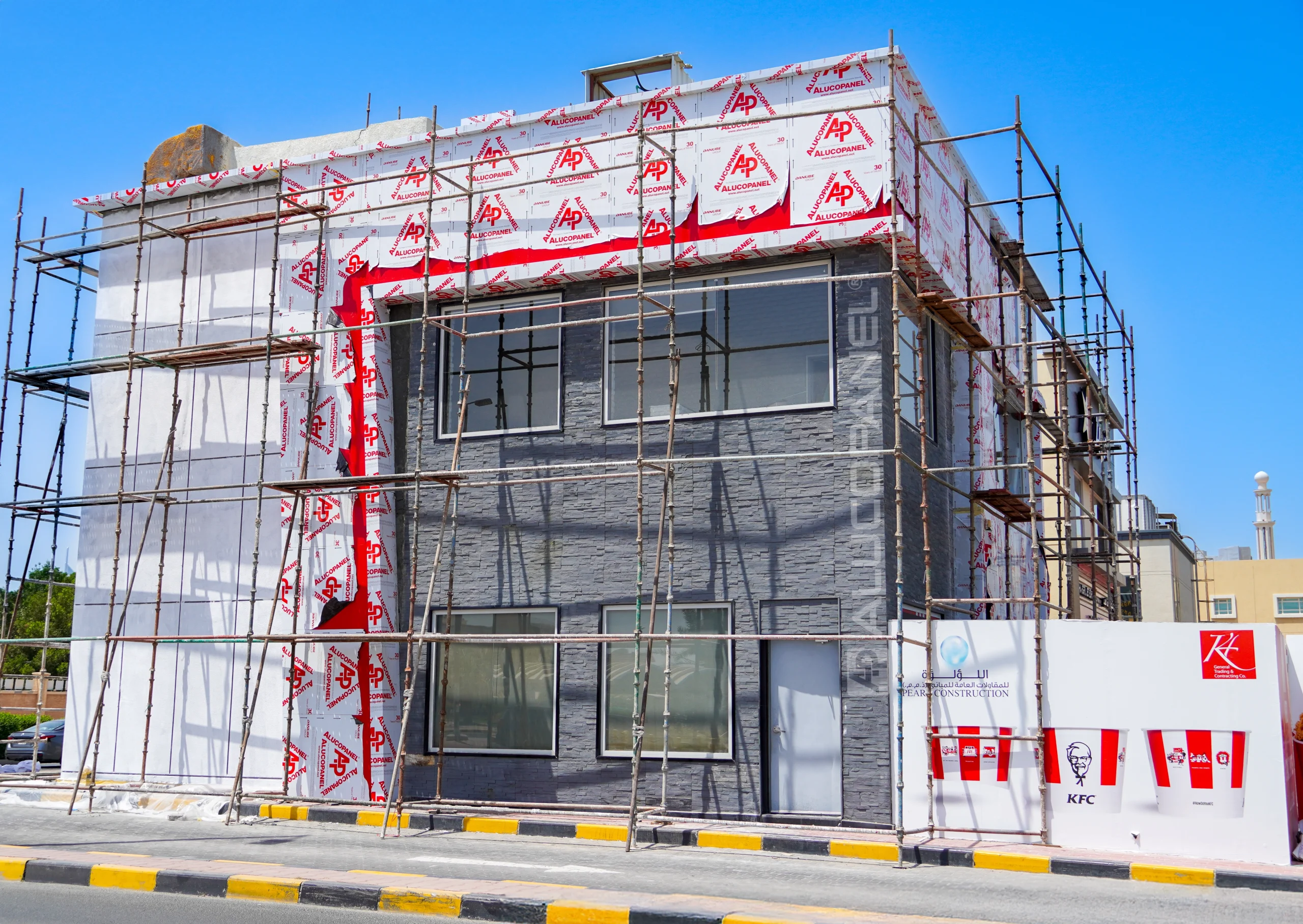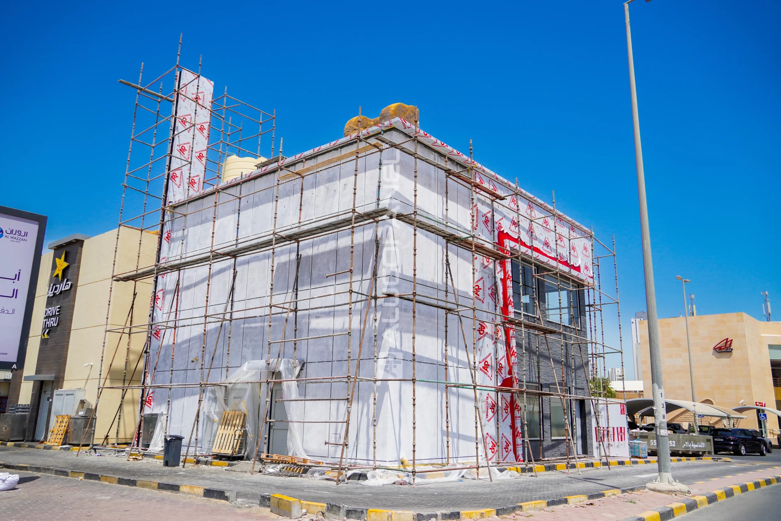 latest outlet in Al Daiya, Kuwait, features a striking façade designed with ALUCOSIGN® FR panels. The bold color combination of APL S30001 Matt Black and APL S18 Signal Red perfectly reflects the brand’s iconic identity and visual consistency across global locations. In addition to aesthetic appeal, the use of fire-retardant ALUCOSIGN® FR panels ensures enhanced safety and long-term durability, meeting the high-performance standards expected of international commercial projects.