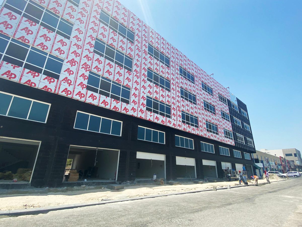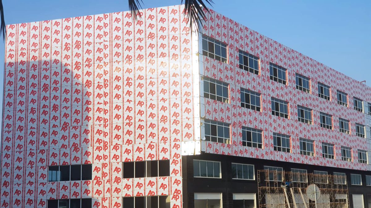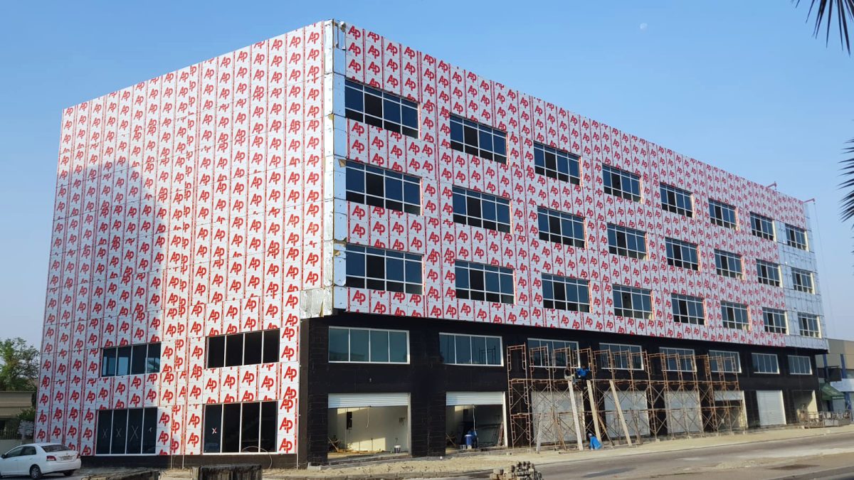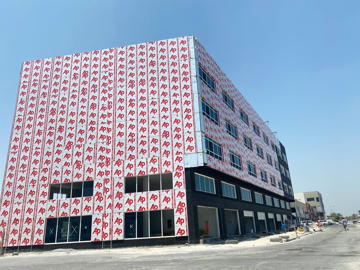 Metallic Bronze and Pearl White of the fire-rated Alucosign® FR installed in the Four Storey Building situated in Abu Saiba, Bahrain, still covered with Alucosign® FR protective film, the brand of elegance. It will soon turn out to be an appealing building.