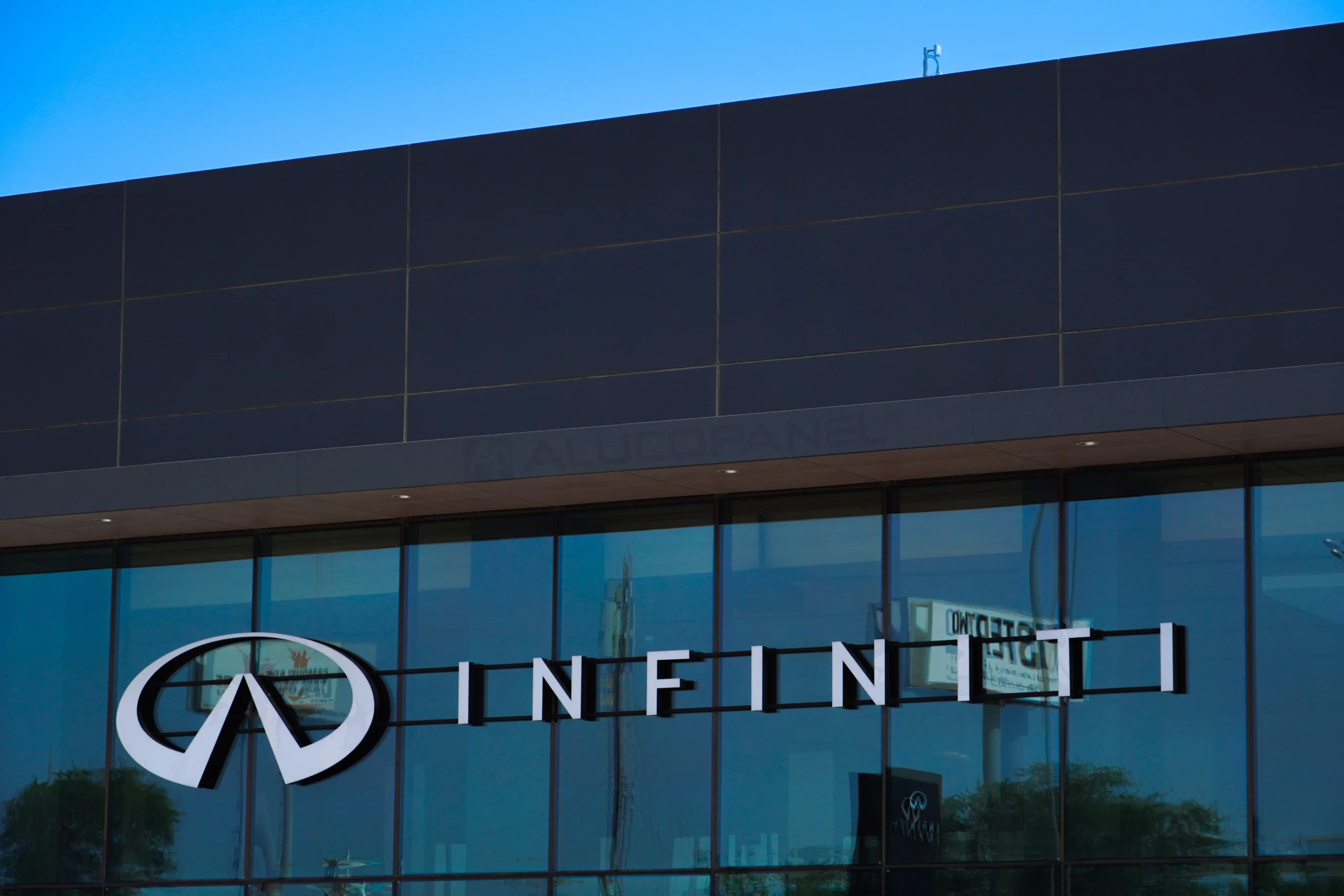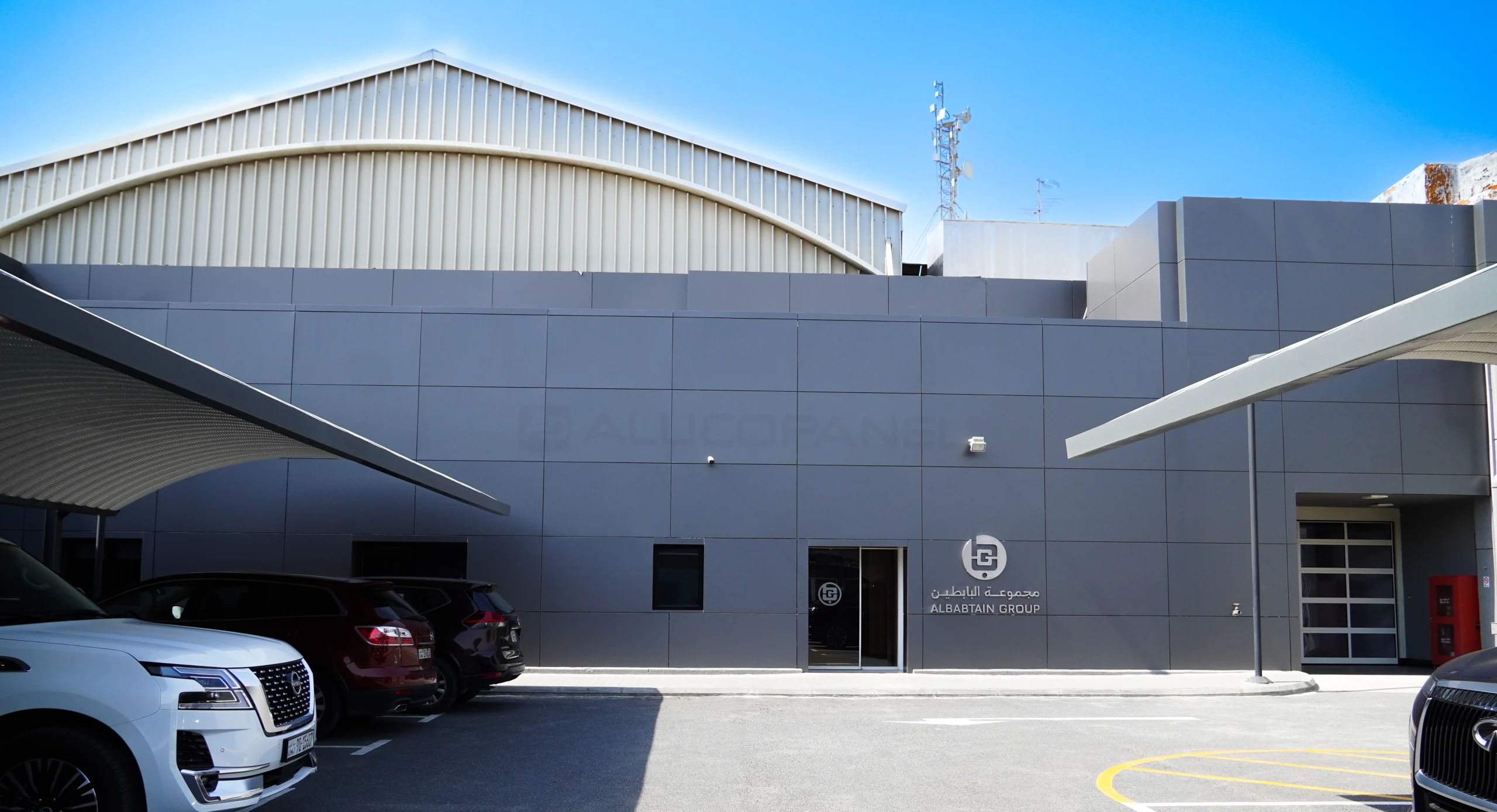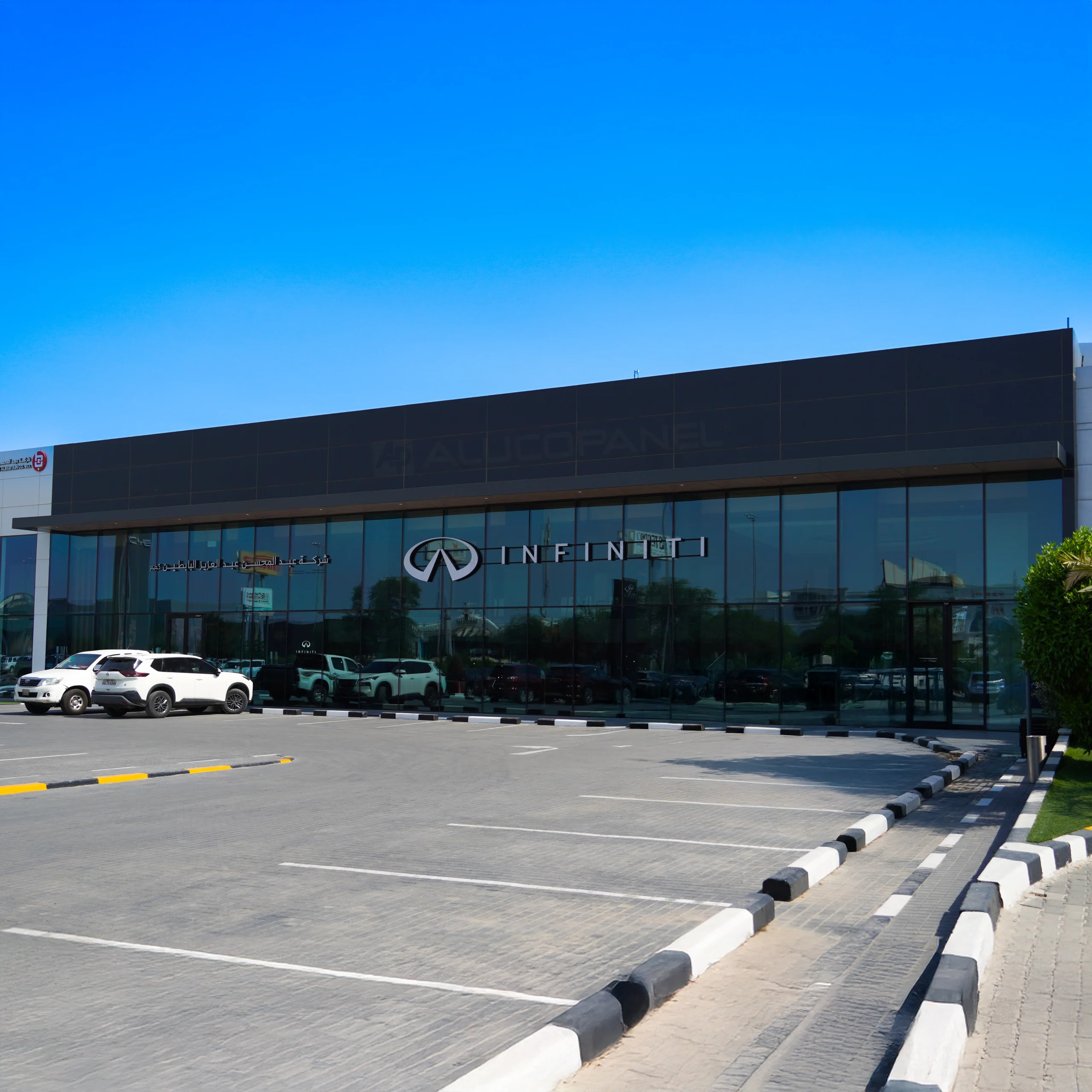 features Alucosign® FR panels in Coal Black and Raw Gray, creating a façade that embodies refined precision and timeless design. Engineered for performance and visual depth, the fire-retardant ACP system ensures lasting durability while reflecting the sleek, refined essence of the INFINITI brand.